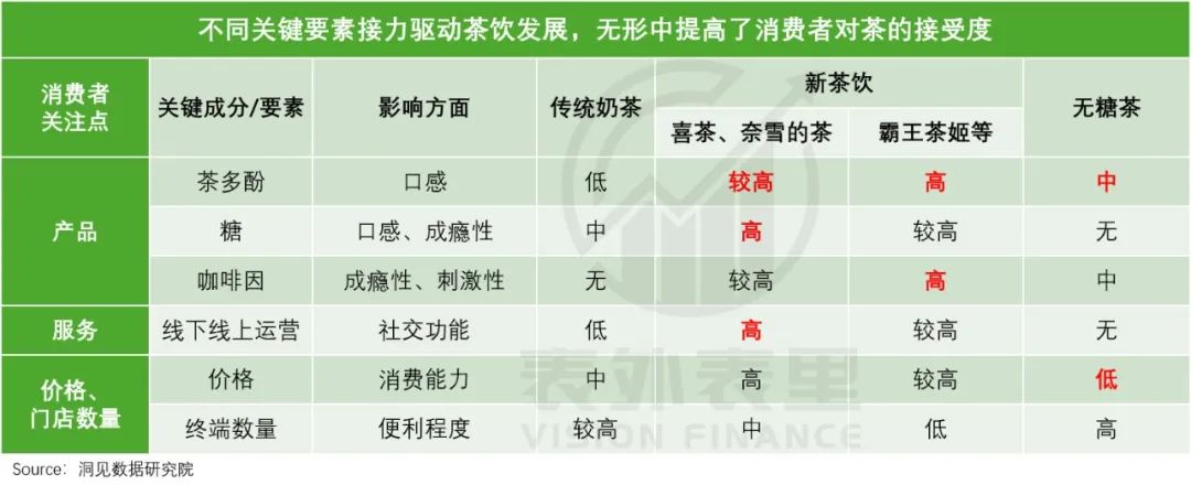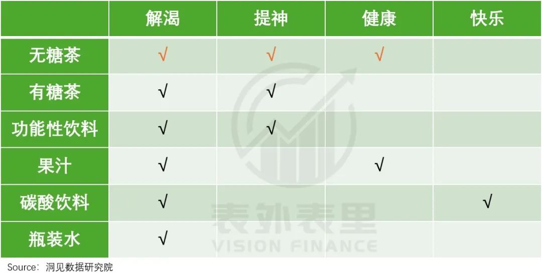 据此拆解无糖茶的成分可以看到,其兼具解渴、提神、健康等功能,而有糖茶、碳酸饮料等其他畅销饮品,大多只能满足2项需求。