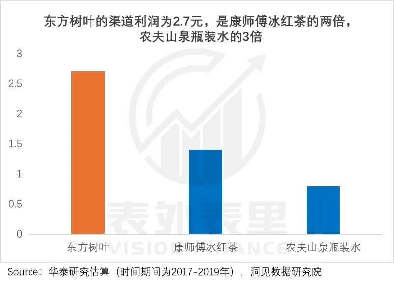 此外可以看到,东方树叶的渠道利润为2.7元,是康师傅冰红茶的两倍,农夫山泉瓶装水的3倍。重金之下,渠道也更敢于以价换量。