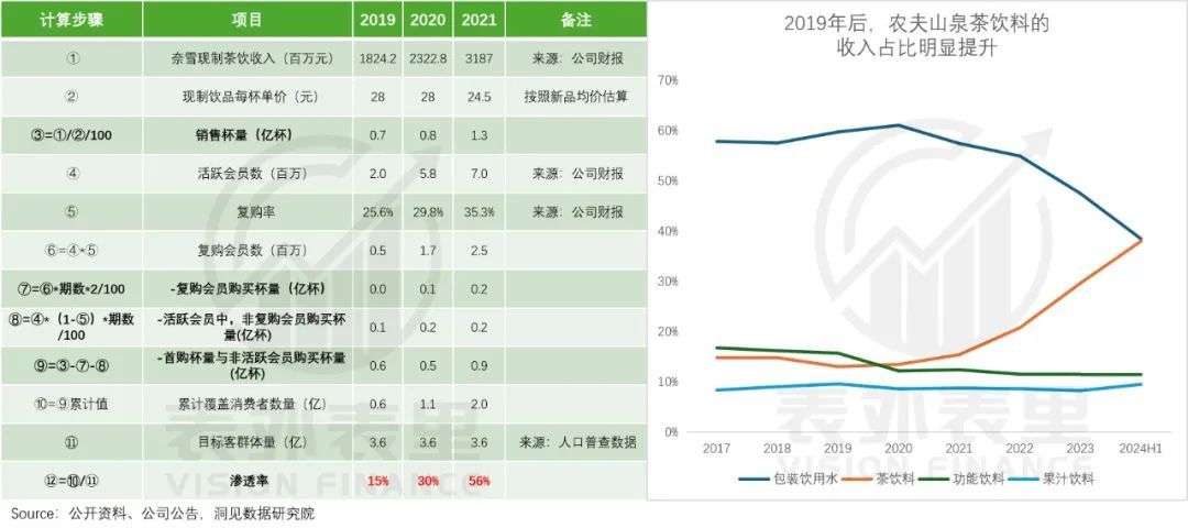 如下图,2019-2021年,奈雪的茶在年轻人中的渗透率从19%上涨到56%;同一时期,茶饮料对农夫山泉的收入贡献逐渐提升。
