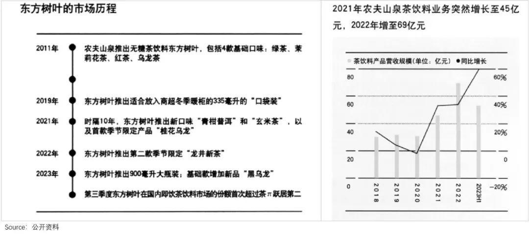 紧接着的2018年,被钉上“难喝”耻辱柱的东方树叶开始口碑好转——农夫山泉创始人钟睒睒在访谈中突然爆料,一直拖后腿的东方树叶“销量跃进,业绩扭亏为盈”。