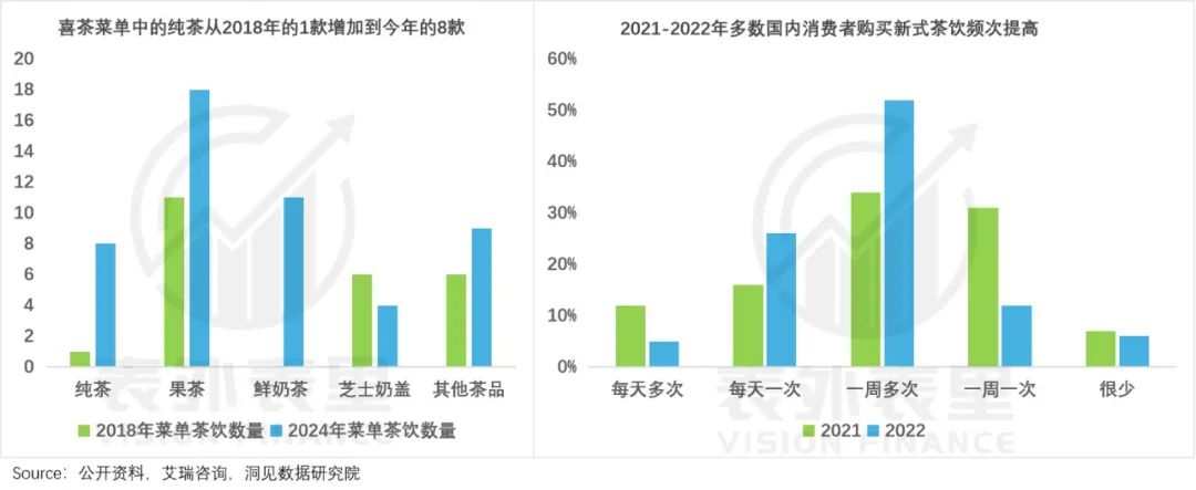 这还没完,之后茶百道、古茗等二线茶饮,以性价比优势迅速崛起、快速放量,迫于竞争压力的喜茶奈雪们,开始增加成本更低的纯茶供给——2018-2024年,喜茶菜单中纯茶从1款增加到8款,新茶饮进入“茶味大于奶味”时代。