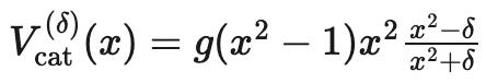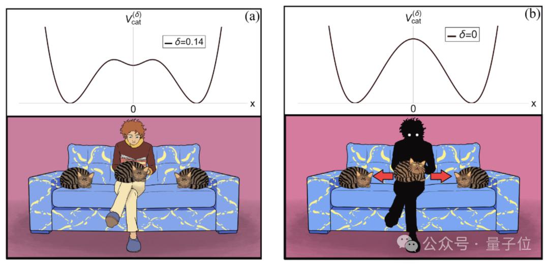 该陈述的第二部分是通过势能对δ的依赖性来捕捉的。也就是说当δ=0时, x=0是不稳定的,这表明在任意小的扰动下,猫都会偏离人。随着δ的增长,需要更强的刺激才能将猫从人身上分离。