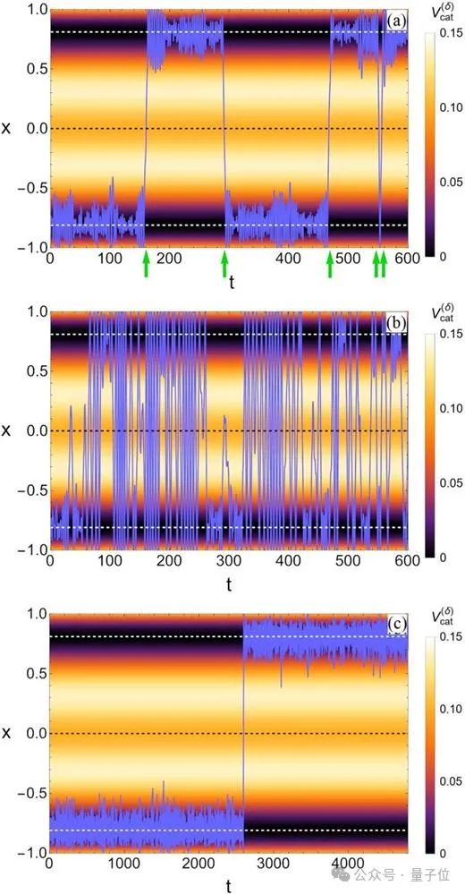 (a)显示猫可能突然从一个平衡点跑到另一个平衡点,在那里停留一段时间,然后再次随机地回到上一个平衡点。(b)为小猫(c)为老年猫