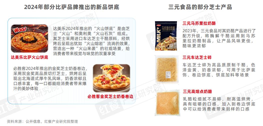 针对比萨品牌的饼底创新需求,一些上游企业也在积极跟进。以三元食品为例,其为比萨品牌提供多种芝士解决方案,包括三元马苏里拉奶酪、三元高熔点奶酪、安尼莫精致马苏里拉奶酪以及车达芝士碎等。这些产品适用于卷边饼底或饼底加料等场景,以帮助比萨品牌实现饼底创新和产品口味的多样化。