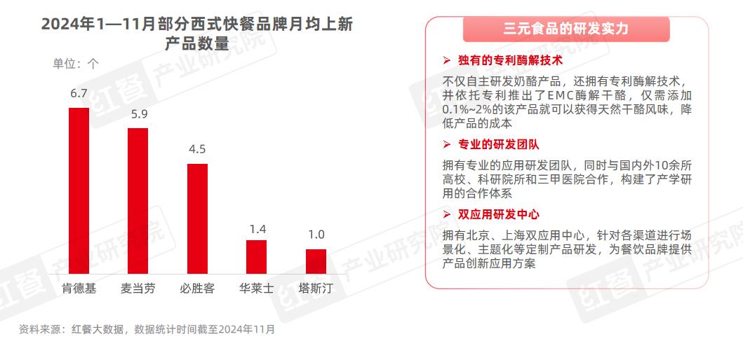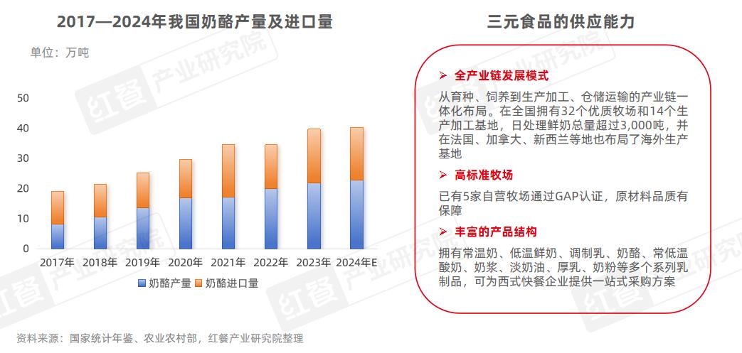 同时,我国也涌现了一批实力较强的奶酪供应企业,比如三元食品。三元食品从1985年开始自主研发奶酪产品,是我国首个拥有自主加工奶酪生产技术的企业。目前其拥有华北区域最大的奶酪生产基地,年产量超2万吨。产品覆盖常温奶、低温鲜奶、调制乳、奶酪、常低温酸奶、奶浆、淡奶油、厚乳、奶粉等多个系列乳产品,可为西式快餐企业提供一站式采购方案。据红餐产业研究院了解,诸多西式快餐品牌均与其建立了长期合作关系。