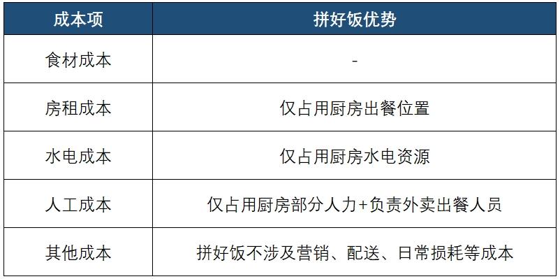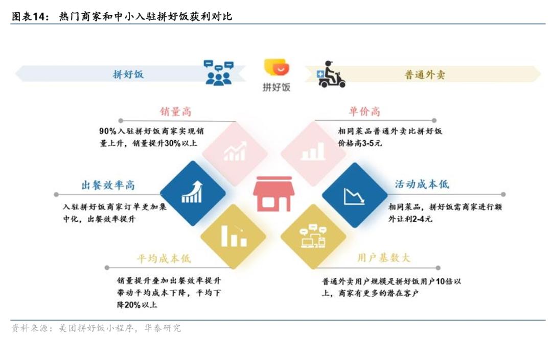 华泰证券在研报中提到,拼好饭商家以价换量,通过高周转盈利,具有成本优势的商家入驻拼好饭将展开错位竞争提升销量。