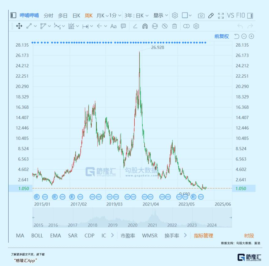 10年前,呷哺呷哺发行价为4.7港元/股,尽管2021年一度上涨至26港元,但至今也只剩1港元,如果持有十年,那么已经亏去近80%。