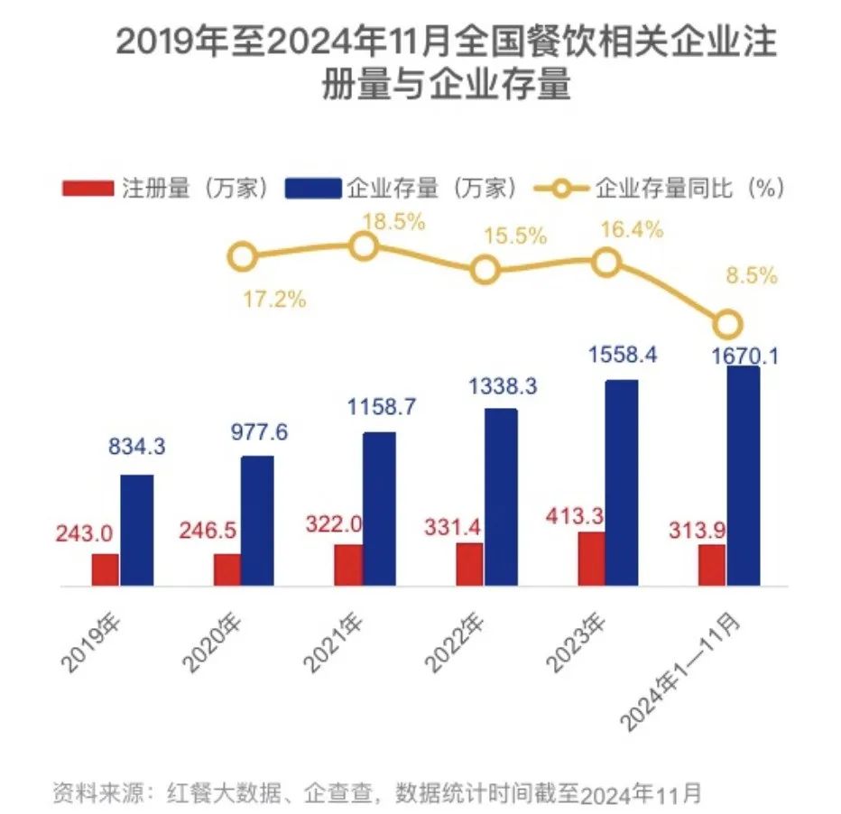 企查查数据显示,近几年,餐饮相关企业的注册数量连年走高,企业存量亦逐年递增。