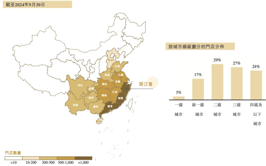 一是“下沉”。根据招股书,截至2024年9月30日,古茗有80%的门店位于二线及以下城市,在前五大现制茶饮店品牌中比例最高,根据窄门餐眼数据,超过蜜雪冰城。也因此,很多一二线城市的人都没有听说过古茗。