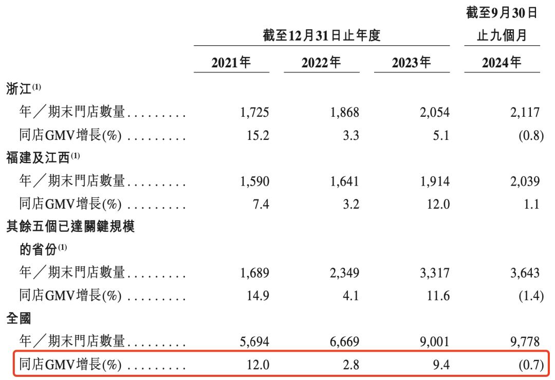 虽然古茗的整体门店规模还在增长,但老店的同店GMV(已经开业一定时间以上的门店的GMV)不增反降。除福建及江西两大市场外,今年前三季度,古茗在浙江及其他核心5大省份的同店GMV出现0.8%及1.4%的下滑,使得全国同店GMV微跌0.7%,而去年为上涨9.4%。这也是古茗过去四年首次出现同店GMV负增长的情况。