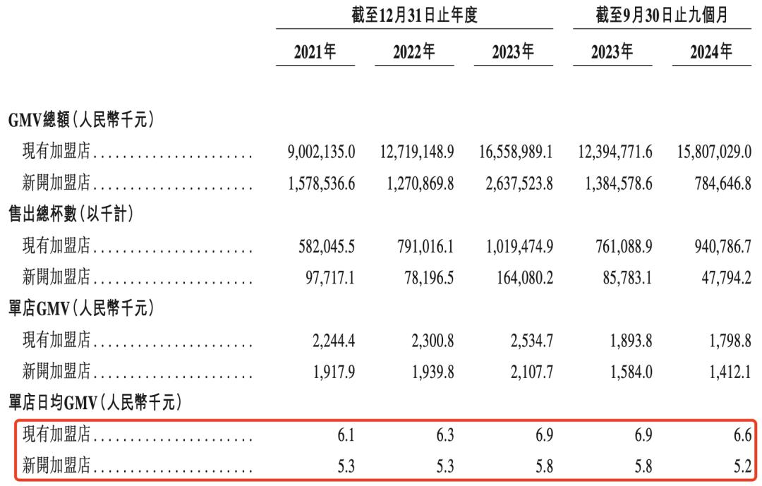 从数据来看,今年前三季度现有加盟店的日均GMV从6900元下降至6600元降幅为4.4%;同期新开加盟店的日均GMV从5800元下降至5200元,降幅为10.3%。今年前三季度的加盟商流失率为11.7%,高于去年的8.3%。