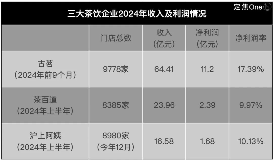 好在,古茗的营收和利润双增长,且利润率高于茶百道和沪上阿姨。根据招股书,古茗2024年前三季度收入为64.42亿元,同比增长15.08%;期内利润为11.20亿,同比增长11.78%,同期净利润率超17%。