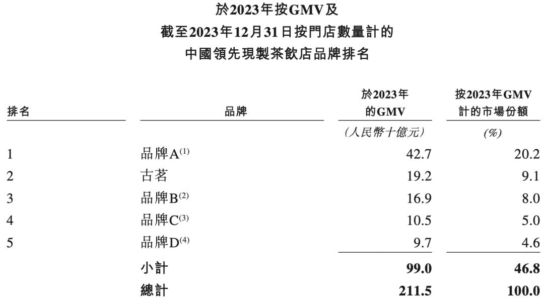 在古茗的招股书中,将中国的现制茶饮店的市场格局按GMV进行了排序,根据推算,霸王茶姬排在第四。2023年,前五名分别是蜜雪冰城、古茗、茶百道、霸王茶姬与沪上阿姨,对应GMV分别为427亿、192亿、169亿、105亿与97亿元,市场份额分别在20.2%、9.1%、8%、5%和4.6%。