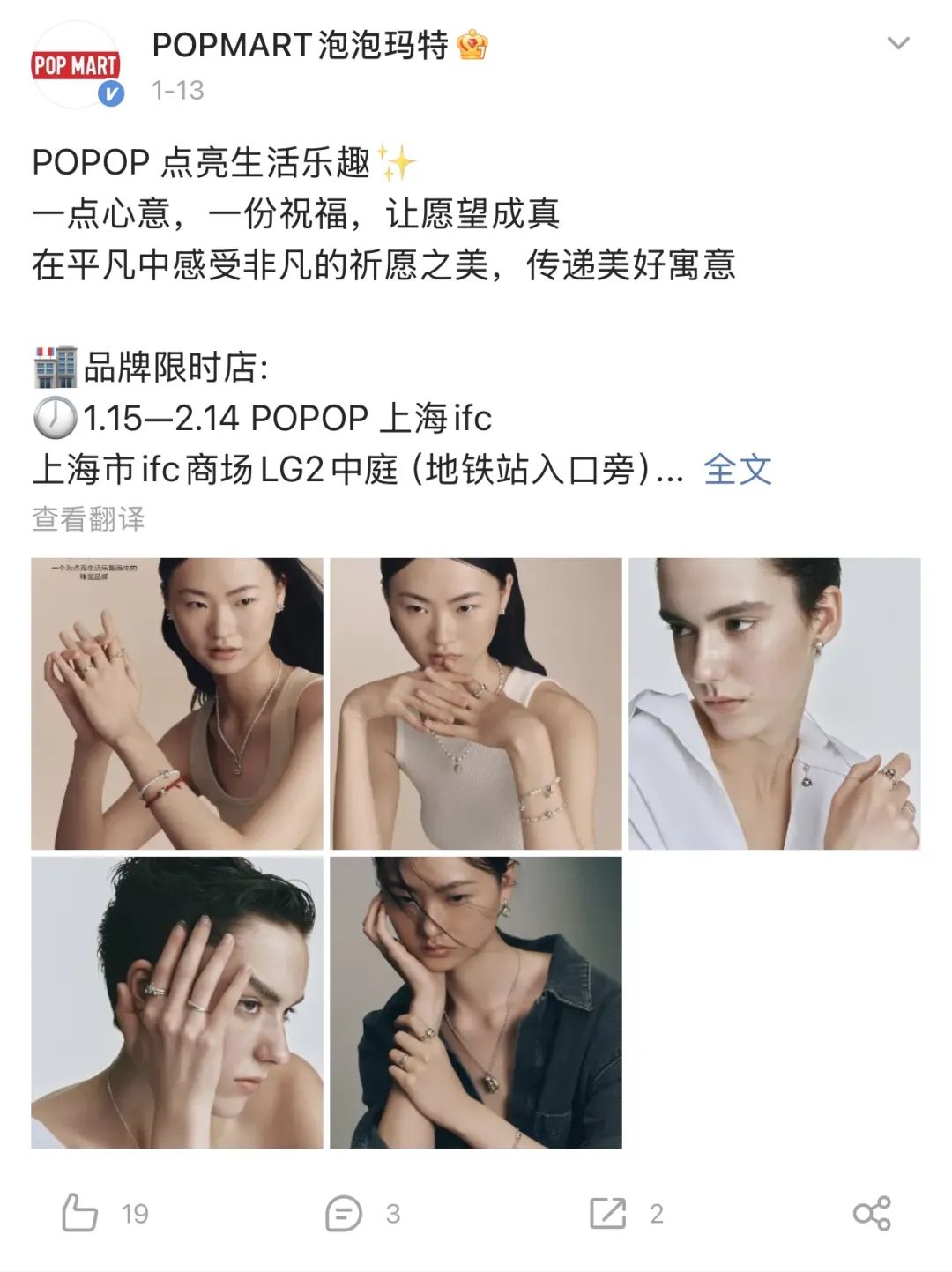 而这些成绩,在过去2年已经让泡泡玛特“悄悄”完成了从盲盒到饰品的破圈,也为这次跨界珠宝新品牌的推出做好了市场铺垫。