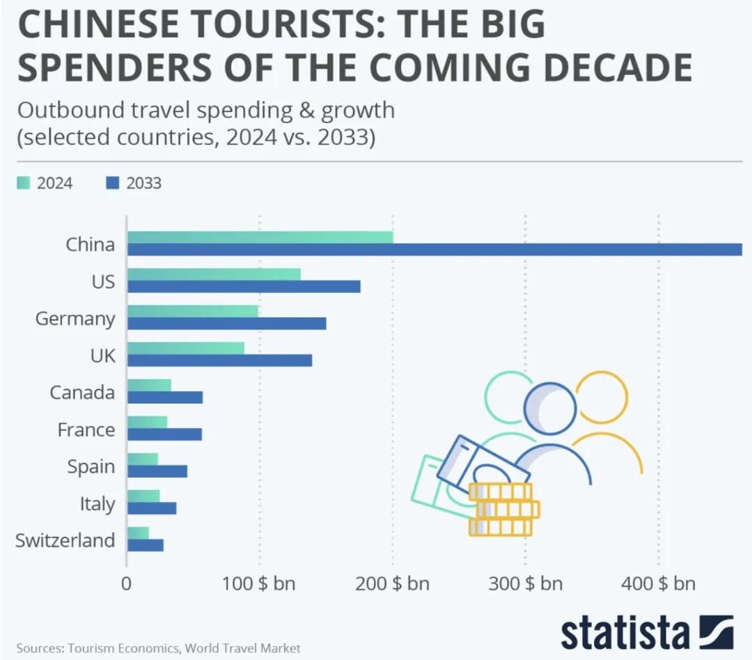 不止是出国搬砖,中国人也在涌向出境游,据statista,中国已问鼎全球出境游最大支出国,且增长还在加速。