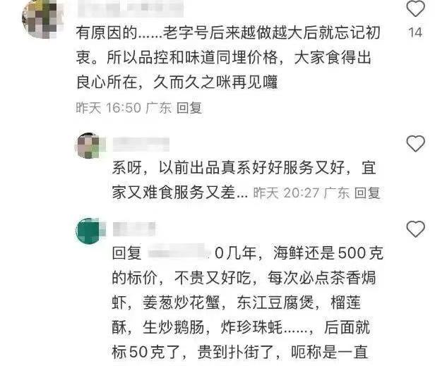 2023年6月,#6000元一桌的婚宴超7成都是预制菜#话题登上微博热搜,曾引发广泛争议,也一度激发起大众对酒楼菜品的质疑。如今,再翻看各大传统酒楼门店的评论区也可以看到,不少消费者吐槽,传统酒楼菜品质量有变差,性价比越来越低,服务质量和服务意识跟不上……