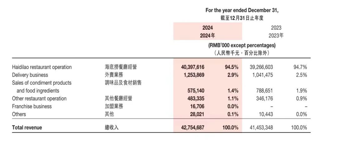 海底捞的第一大收入来自于餐厅门店营收,占到了总营收的九成多。但近两年,其外卖收入增速较快,2024年达12.54亿元,同比增长20.4%,这主要得益于海底捞一人食产品的开发。