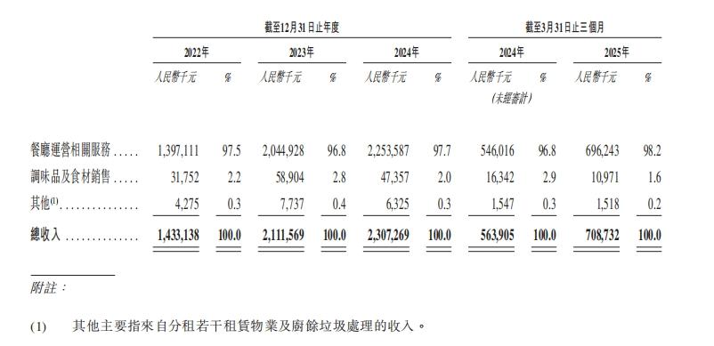 相比之下,巴奴的收入较为单一,集中于堂食主业,无外卖业务,高度依赖餐厅门店。2025年Q1,这部分业务营收占比达98.2%。