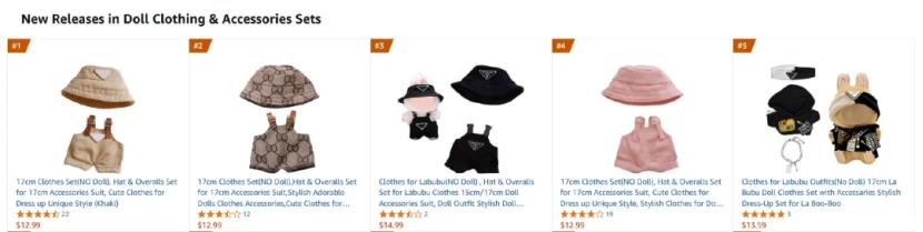 其中,最热销的类目为Labubu相关服饰套装。在亚马逊“Doll Clothing & Accessories Sets”的新品热销榜上,销量排名前五的产品均为符合Labubu尺寸(或产品图片直接使用Labubu为“模特”)的服饰产品。其中榜首的“工作服”上月销量已过千。