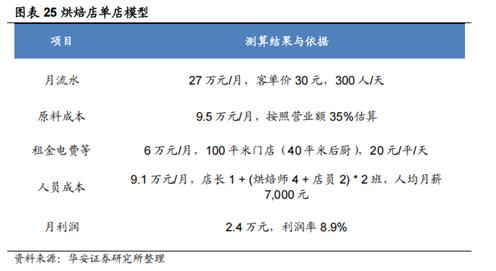 华安证券在一份行业研报中,以一间约100平方米的城市烘焙店为例测算,在月流水27万元的前提下,原料成本按营业额35%估算约为9.5万元,租金及水电约6万元,人员成本约9.1万元,门店最终月利润只有约2.4万元,对应利润率约8.9%。