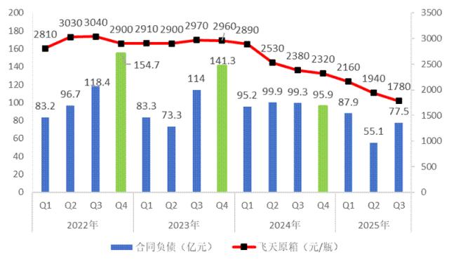 这一点也可以在合同负债中得到验证。整理2022-2025年贵州茅台合同负债与飞天茅台批价制作下图。贵州茅台合同负债在年度内呈现一定的周期性,一般四季度、三季度为前两位高值,对应春节、中秋备货旺季。伴随飞天茅台于2024年2季度进入下行通道,合同负债在2024年3季度开始各季度均同比大幅下降。反映出渠道动销压力增大,现金回款减少,渠道库存逐渐累积,打款订货意愿转弱。