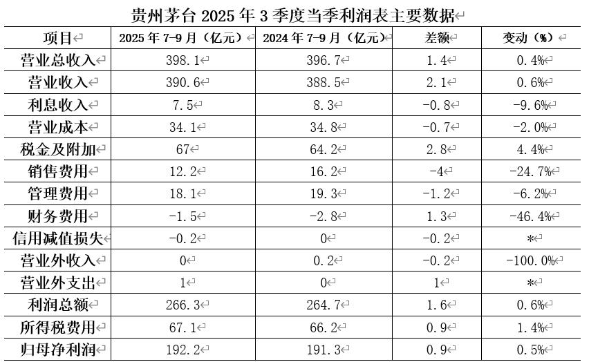图:贵州茅台2025年3季度当季利润表主要数据,