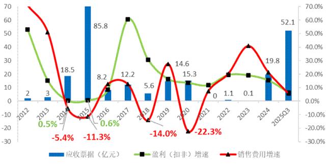 将2012-2025年贵州茅台盈利增速、销售费用增速、应收票据数据对比分析(见下图),可以发现2014年、2015年贵州茅台财务数据与25年三季度特点一致。
