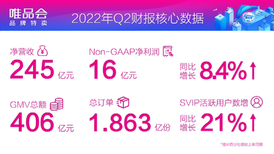 8月19日,中国领先的在线品牌折扣零售商唯品会发布2022年第二季度财报,公司当季实现净营收245亿元(人民币,下同),归属于公司股东的Non-GAAP净利润16亿元,同比增长8.4%;利润水平和整体利润率均实现同比增长。