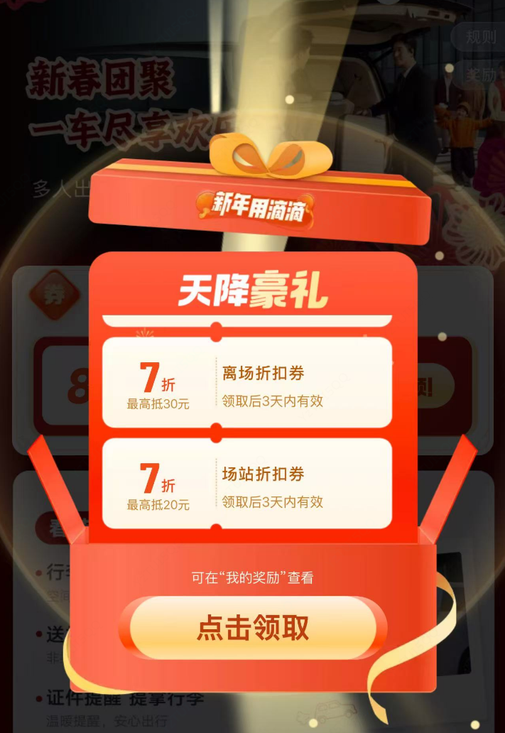 春运的大幕已经开启,机场、火车站等大型交通枢纽愈发繁忙。活动期间,在滴滴出行App或小程序内,进入专车活动会场,用户每天都可以领取到2张机场、火车站场景下可用的7折专车优惠券,券包累计最高可省50元。