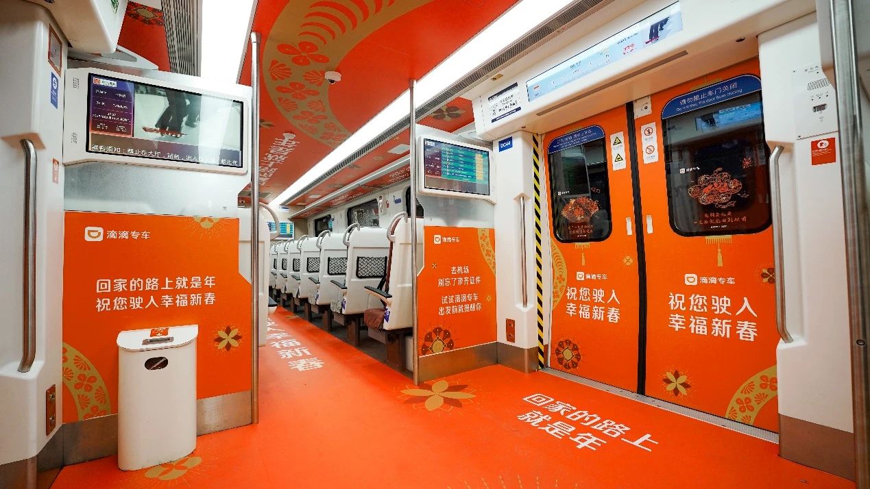 年味不仅在专车里,1月14日至28日期间,乘坐首都机场快轨的旅客,将有机会乘坐到“滴滴专车新春主题”彩蛋列车。滴滴专车不仅将车窗花延伸到了彩蛋列车中,还为往来机场的旅客送上出行的温馨提示。