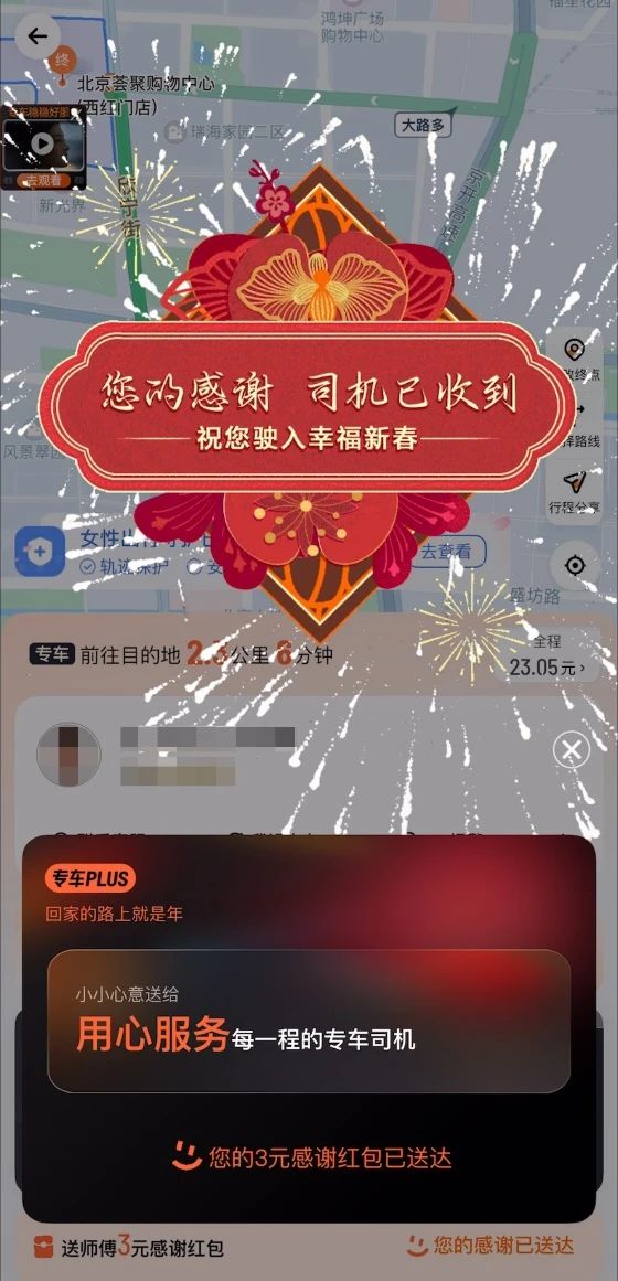 滴滴专车十年如一的稳稳好服务,离不开每一位专车司机的辛勤付出。感谢专车司机师傅们辛勤出车,为城市出行保驾护航,专车PLUS会员权益中,平台每月会免费赠送会员用户3张3元感谢红包,鼓励乘客在对专车司机服务感到满意时,将感谢红包赠送给司机,点赞好服务。春节期间,PLUS会员用户通过滴滴出行App或小程序向专车司机发送感谢红包后,同样会在订单行程页面收获来自专车的新春祝福。
