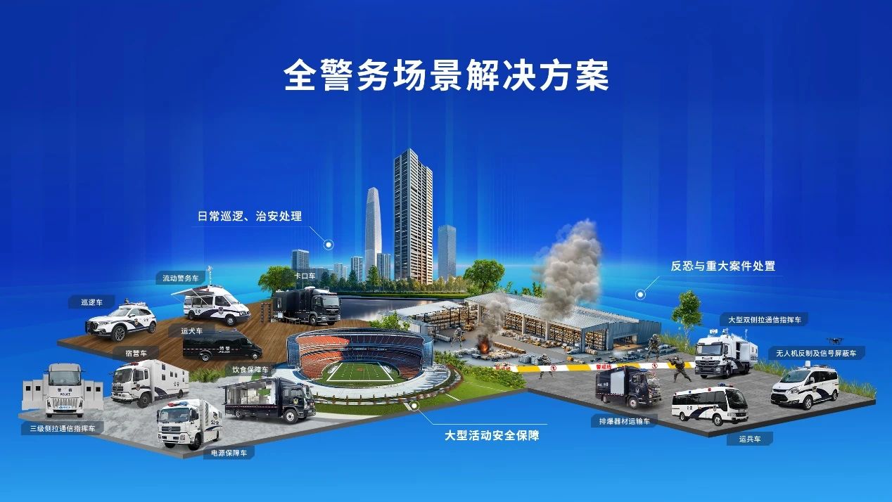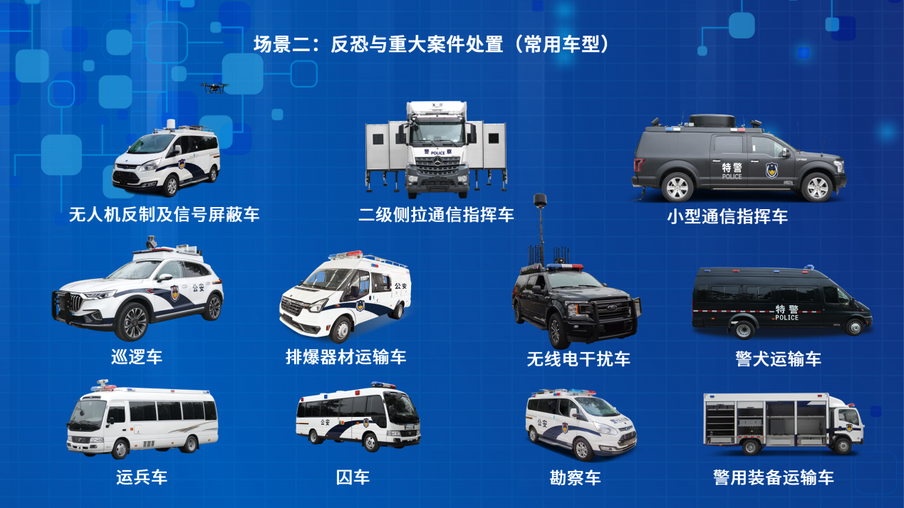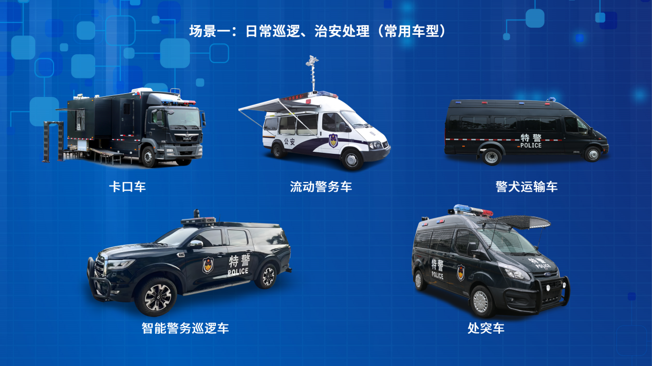 例如,在日常巡逻和治安处理场景中,巡逻车、流动警务车、卡口车等产品各司其职。巡逻车凭借灵活机动性,能够快速响应辖区内各类治安状况;流动警务车则成为可移动的警务办公平台,方便警员在现场开展工作;卡口车精准把控交通要道,助力交通秩序维护与人员管控。”