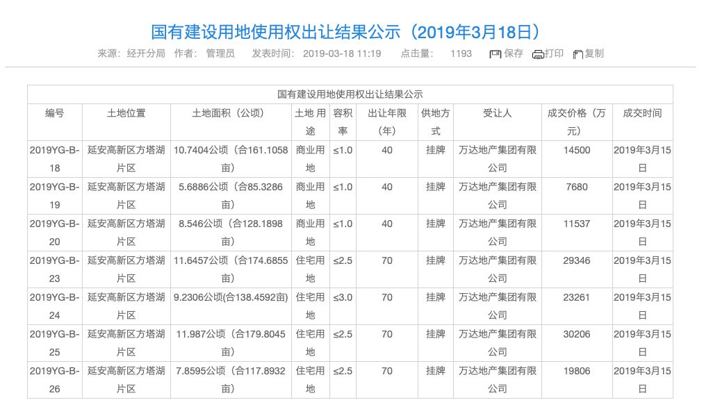 投中网在延安国土局以及兰州土地交易中心了解到,2019年3月15日,万达通过旗下“万达地产集团”在延安以12.63亿元拍下7宗开发用地(共计985.47亩);6月12日,“万达地产集团”又在兰州以71.924亿元拍下了28宗开发用地(共计1356.857亩)。