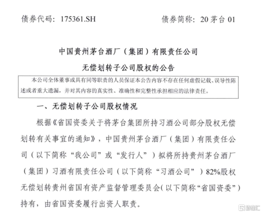 此前,中国贵州茅台酒厂(集团)有限责任公司发布公告,拟将所持贵州茅台酒厂(集团)习酒有限责任公司82%股权无偿划转贵州省国有资产监督管理委员会持有,由省国资委履行出资人职责。