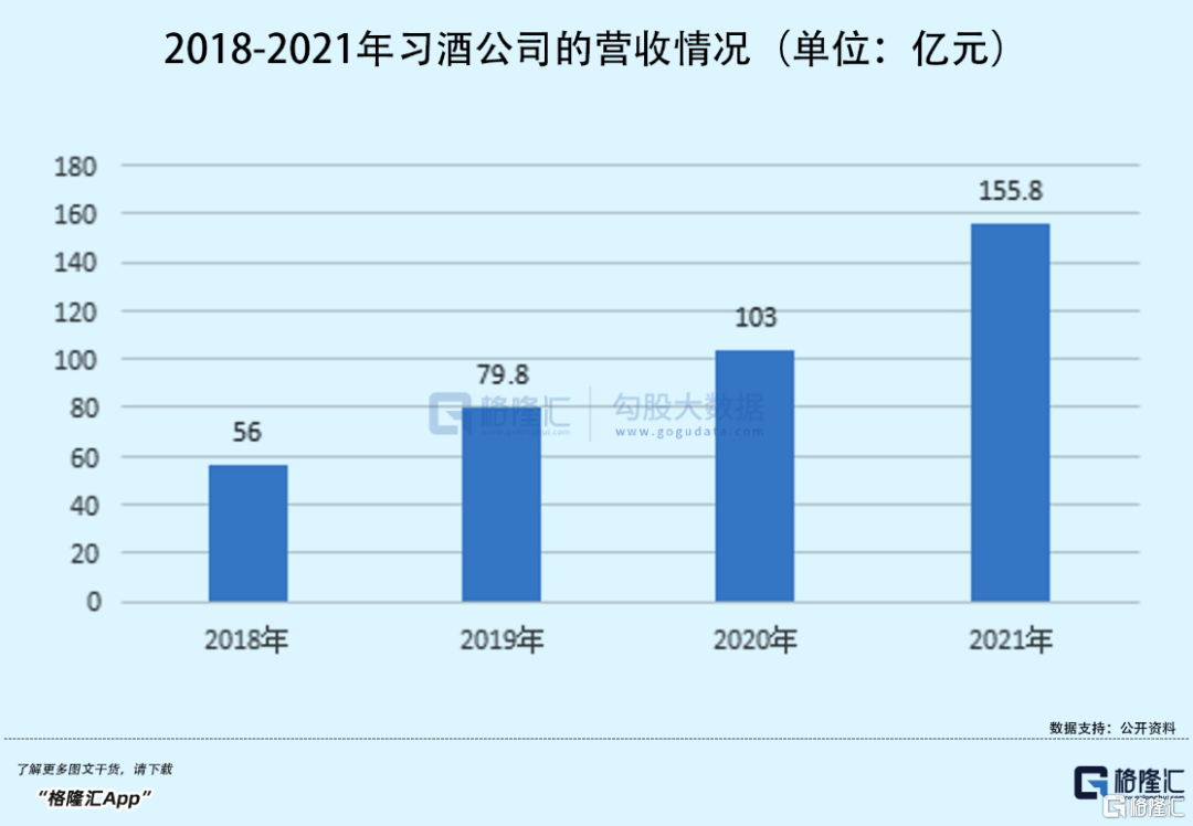 2018年张德芹交棒钟方达,后者延续了此前的发展大方向,2019年习酒高端新品“君品习酒”上市,继续将酱酒往高端化、品牌化、全国化方向发展。果不其然,白酒的“酱香热”爆了,习酒站上了风口,经营回暖,业绩复苏。公开数据显示,2018年、2019年、2020年、2021年习酒的营收分别为56亿元、79.8亿元、103亿元、155.8亿元,上升势头较旺;截至今年6月15日,习酒公司销售已突破100亿元,完成上半年销售计划。