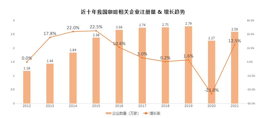 在资本的强势助推下,我国咖啡企业数量也迅速增加。据相关信息服务平台数据显示,2021年我国新增咖啡相关企业2.59万家,同比增长12.5%,平均每天注册达70家。