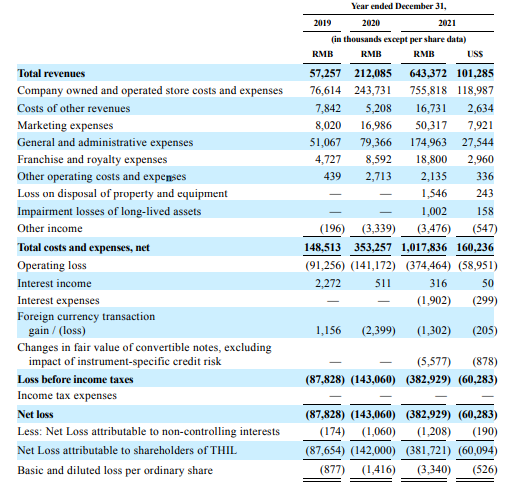 首先从Tims来看,自身的盈利依旧成谜。按照Tims中国区招股书来看,2019至2021年,Tims中国的净亏损分别为8782.8万元、1.4亿元和3.8亿元。