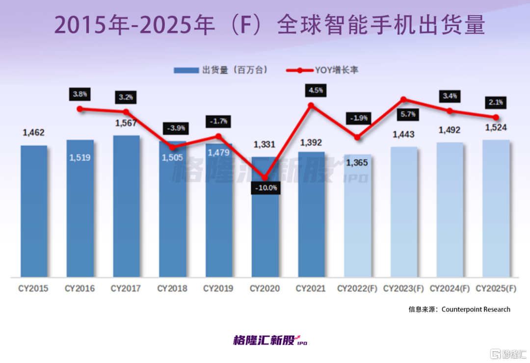 Counterpoint数据显示,2015年至2021年,全球智能手机出货量呈现先升后降的态势,由于中国需求走弱、海外疫情此起彼伏爆发以及全球范围内手机供应链短缺等因素叠加,2021年智能手机出货量同比增长4.5%至13.9亿台,虽呈小幅复苏的状态,但增长率低于市场预期。