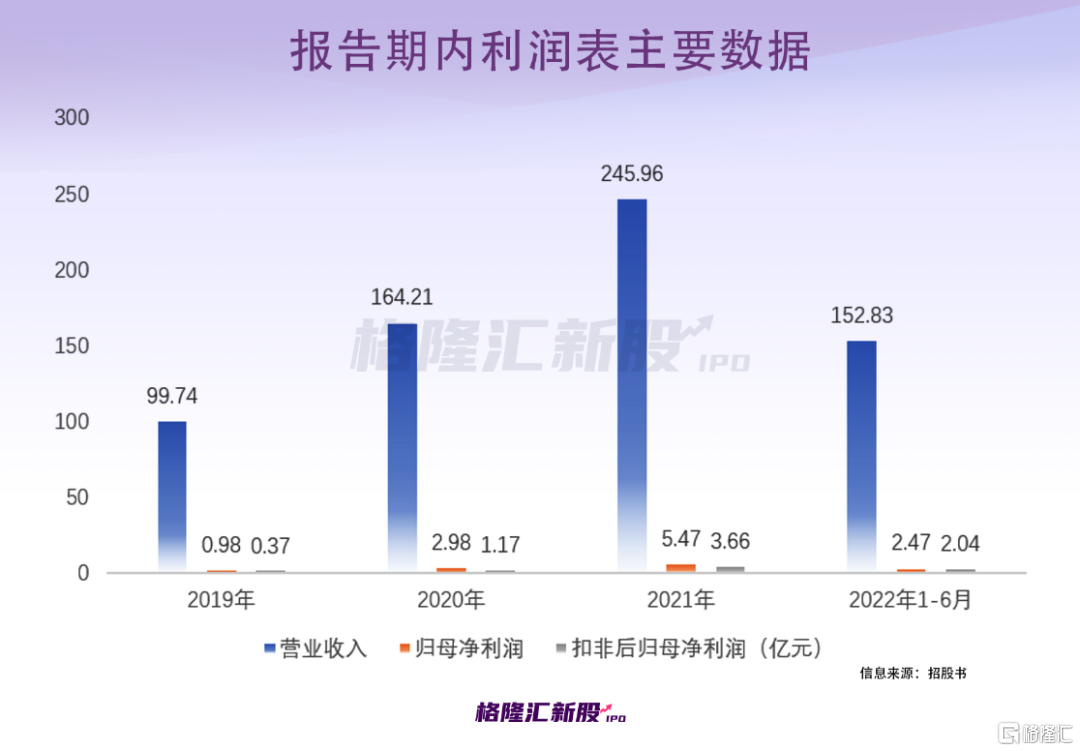具体来看,龙旗科技于2019年至2022年1-6月各报告期的营业收入分别为99.74亿元、164.21亿元、245.96亿元和152.83亿元,相应的扣非后归母净利润分别为3680.56万元、1.17亿元、3.66亿元和2.04亿元。