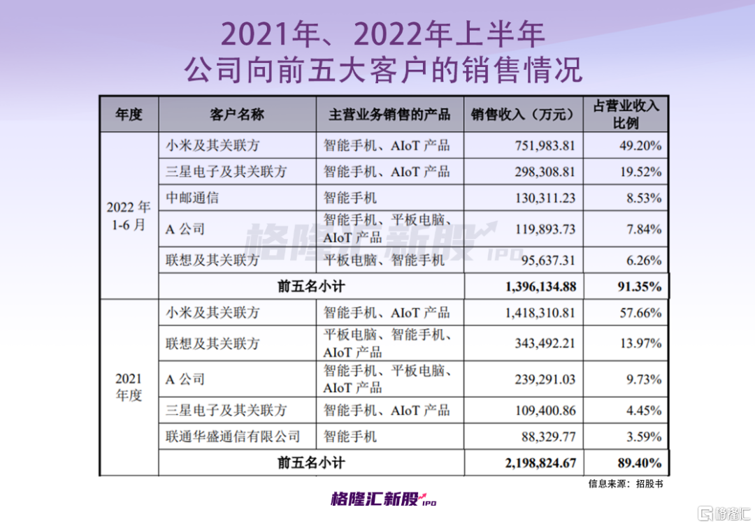 报告期内,公司向小米的关联销售合计占营收的比例分别为12.52%、41.96%、57.66%和49.20%,占比较高。虽然公司也开拓了三星电子、OPPO、中国联通、荣耀、中邮通信等品牌商客户,但前五大客户仍高度集中,在90%左右。