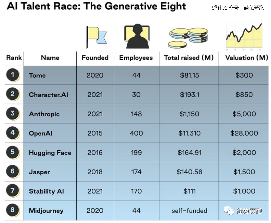 有意思的是,8强中的不少公司也正是由OpenAI、以及谷歌离职的老牌员工开枝散叶而得。