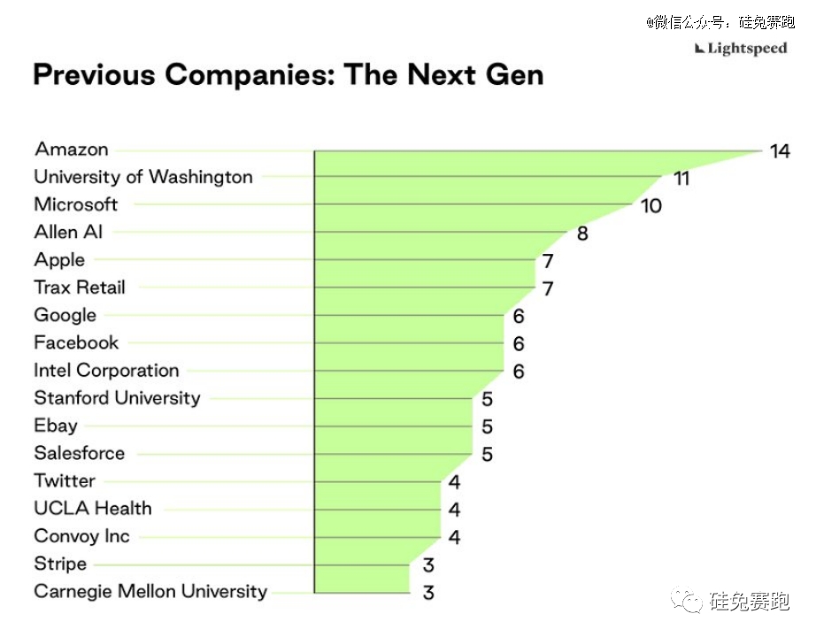 梳理“八强”公司的人才背景,Lightspeed还发现,他们的*的共同点就是,其技术人才的教育背景主要来自许多知名学府(不出所料),如下图所示: