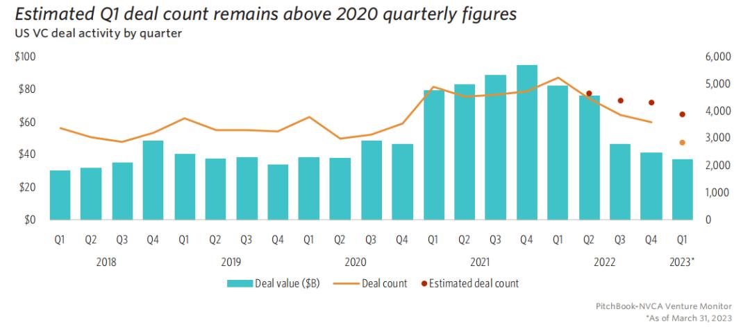 从PitchBook发布的2023年Q1美国VC投资报告来看,在高通胀、加息和监管缩紧等背景的影响下,第一季度整体的交易规模和估值都所有下降,达到了近年来最低的季度总量。
