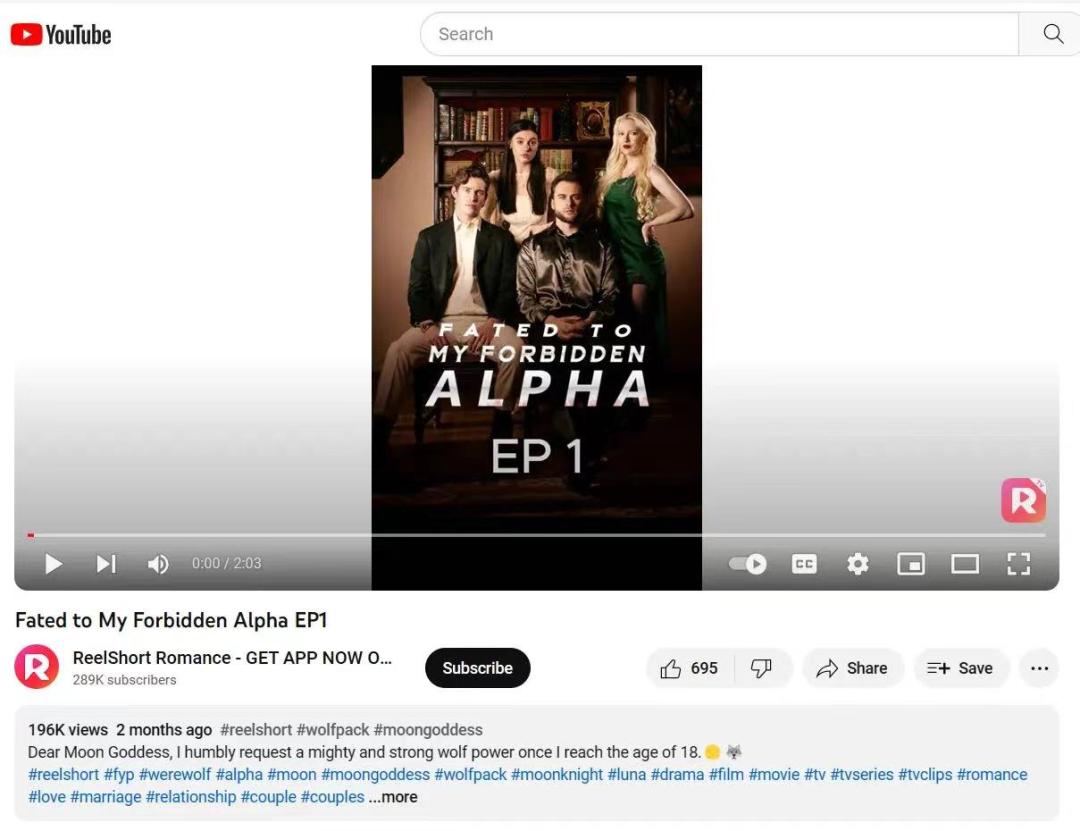 目前欧美市场最具代表性的爆款短剧,当属ReelShort制作的Fated to My Forbidden Alpha,讲述两个狼人部落争夺霸权时,一名年轻女子卷入其中的爱情故事。