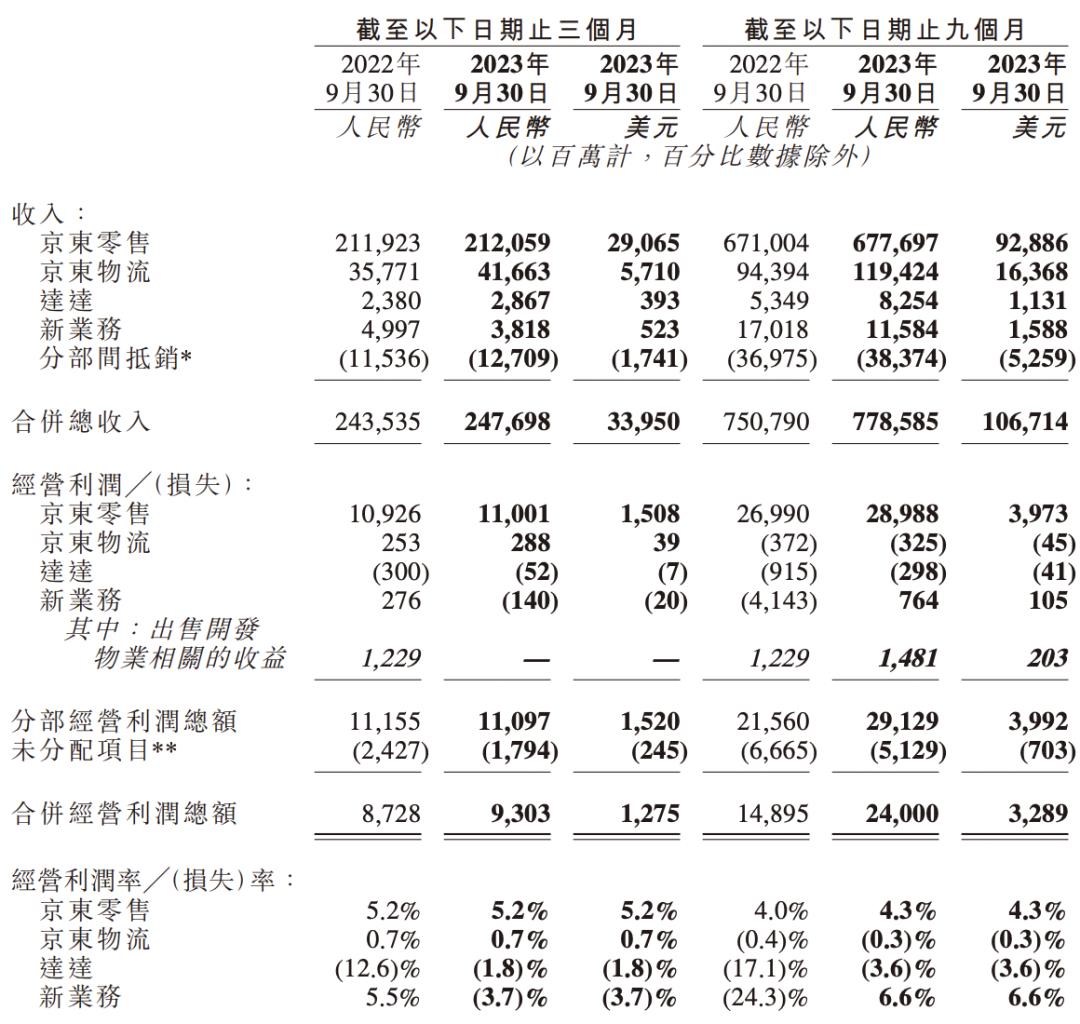 京东各部收入和利润情况 图源 / 京东2023年第三季度财报
