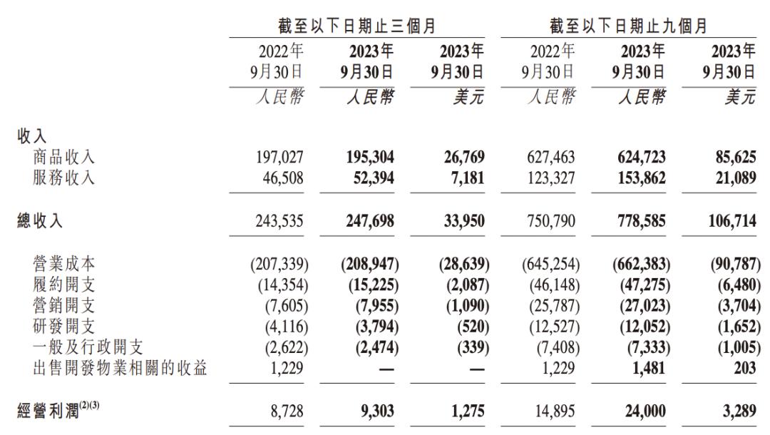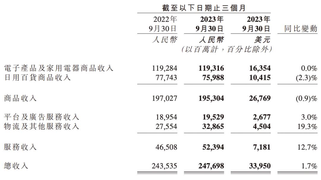 京东的商品收入及服务收入 图源 / 京东2023年第三季度财报