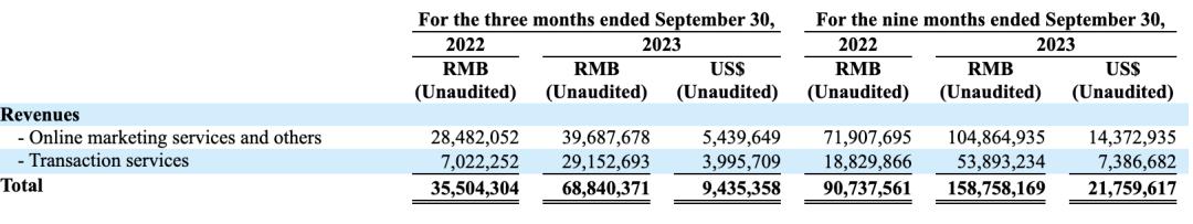 拼多多的电商广告收入及交易服务收入 图源 / 拼多多2023年第三季度财报