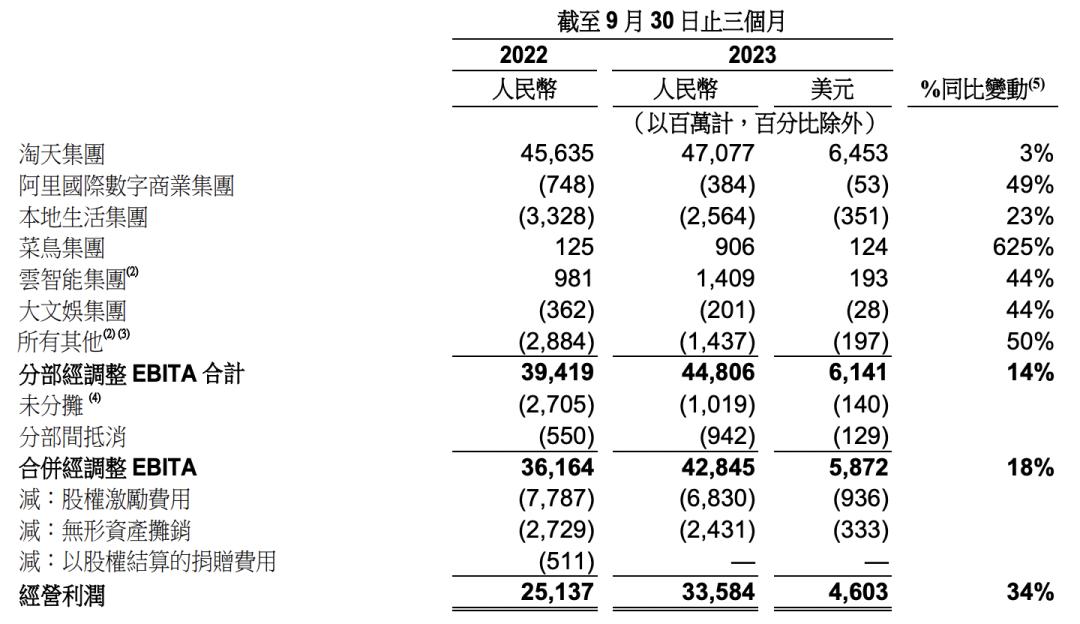 阿里各部经调整EBITA利润 图源 / 阿里2024财年第二财季财报