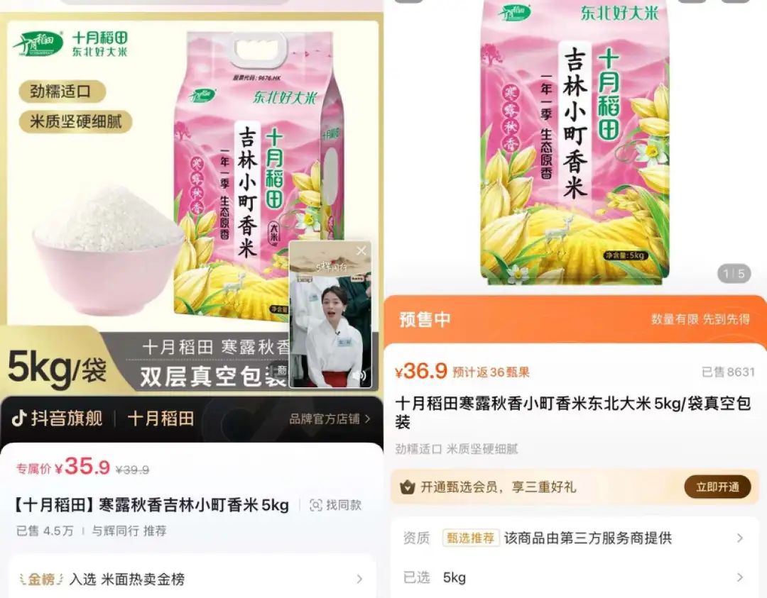 除了没有售卖东方甄选自营产品之外,其余大部分产品都与东方甄选重合,价格略有优势甚至持平。比如十月稻田的一款5kg香米,“与辉同行”直播间35.9元,东方甄选APP非会员价36.9元,有会员晒出了此前31.9元的购买价格;再比如汇柒鲜生鲜礼盒,“与辉同行”和东方甄选直播价格都为269元。