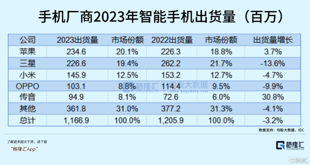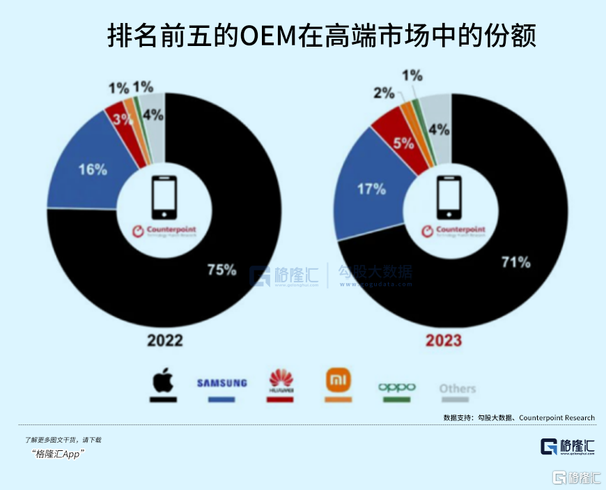 相比2022年,苹果在高端市场的份额去年下滑了4%,其他厂商三星、华为、小米的份额都相应有所提升。